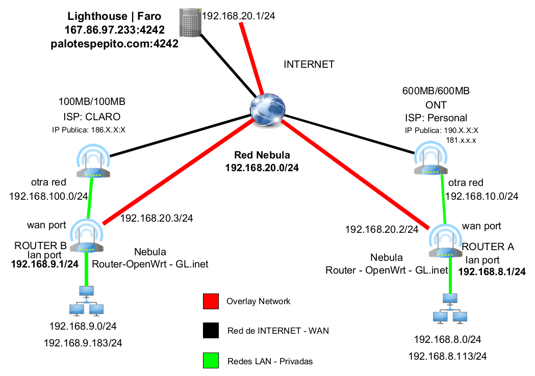 La particularidad de estos laboratorios realizados es que no es necesario instalar nada en alguna PC, Movil, Tablet o Notebook, todo el trabajo lo hacen los routers mencionados. Como extra se configura un servidor Linux Ubuntu con una IP Publica en Internet (lighthouse), cuyo consumo de recursos es bajisimo. La funcion de este ultimo permite que los routers se encuentren entre si en cualquier lugar del mundo donde esten y poder rutear paquetes entre las redes LAN que las conforman. Nebula se creó para proporcionar un mecanismo para que los hosts, en nuestro caso los routers, se comuniquen de forma segura, incluso a través de Internet.